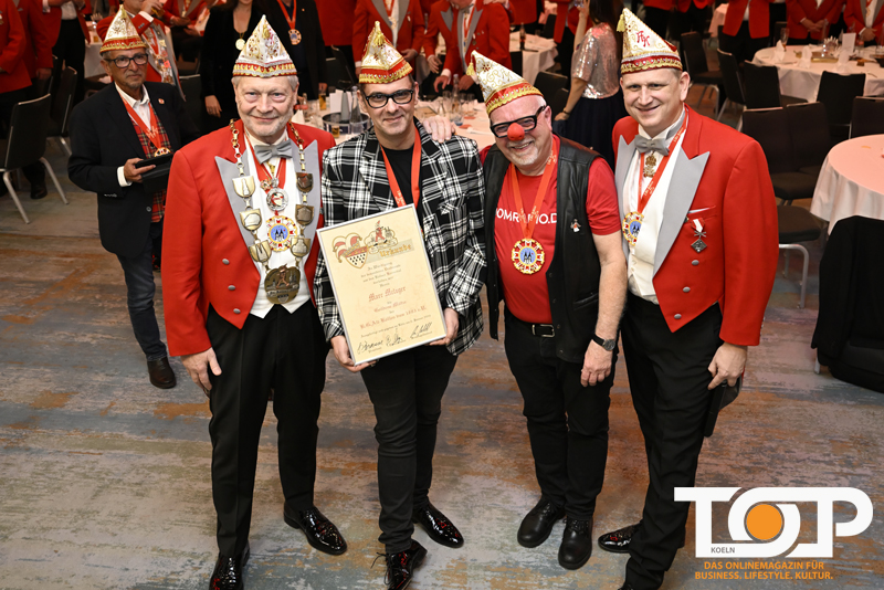 Marc Metzger selbst bedankte sich auf seine unverwechselbare Art und sorgte mit einem kurzen Auftritt für viele Lacher und beste Stimmung im Saal. Auch der Redner Marco Agens („Ne Jung us em Veedel“) trug mit seinem Beitrag zu einem abwechslungsreichen und unterhaltsamen Abend bei. Im weiteren Verlauf des Abends zeichnete das Festkomitee Kölner Karneval mehrere verdiente Karnevalisten mit offiziellen Verdienstorden aus. Christoph Kuckelkorn (Präsident) und Michael Kramp (Leiter Kommunikation) verliehen dabei zwei Verdienstorden an die verdienten Mitglieder der K.G. Alt-Köllen vun 1883 e.V.: Uwe Lüdemann erhielt den Verdienstorden in Silber, Michael Hohmann den Verdienstorden in Gold – jeweils in Würdigung und Anerkennung ihrer langjährigen Verdienste um den Kölner Karneval.